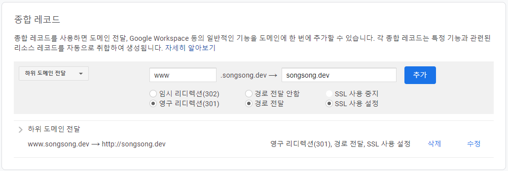www.songsong.dev로 접속했을 때 songsong.dev로 이동하도록(리디렉션) 설정