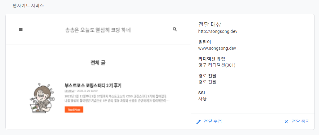 검색엔진에서는 301 영구 리디렉션에서는 www.songsong.dev가 songsong.dev로 변경되었다고 인식, 검색 결과에 반영하는 반면 302 임시 리디렉션은 그렇지 않다.