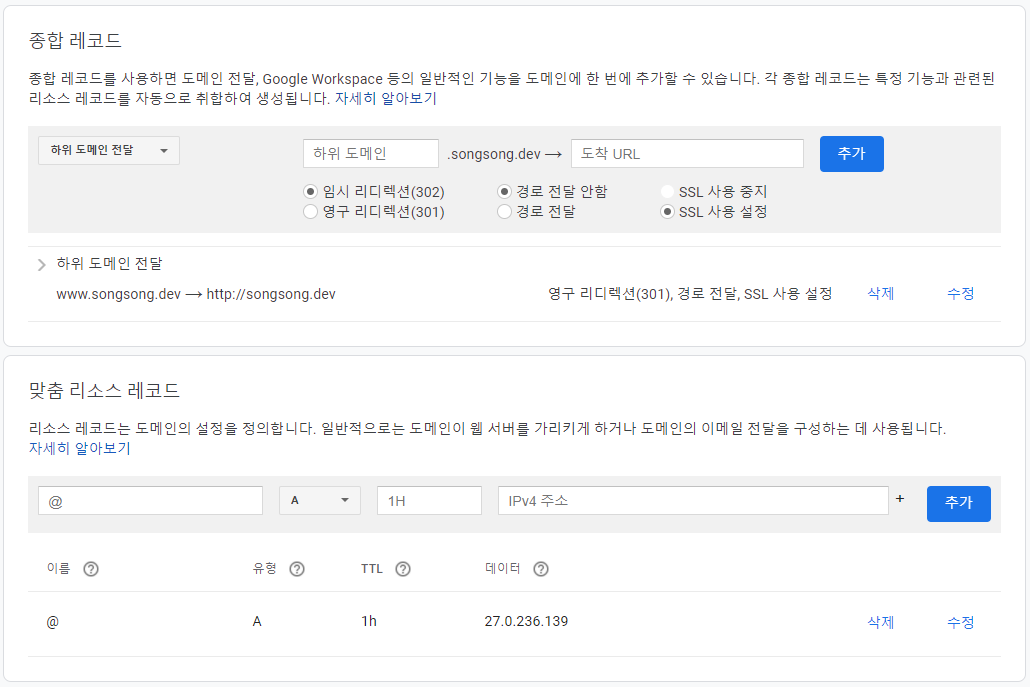 설정하고 나면 구글 도메인 콘솔에서 다음과 같은 화면을 볼 수 있다.