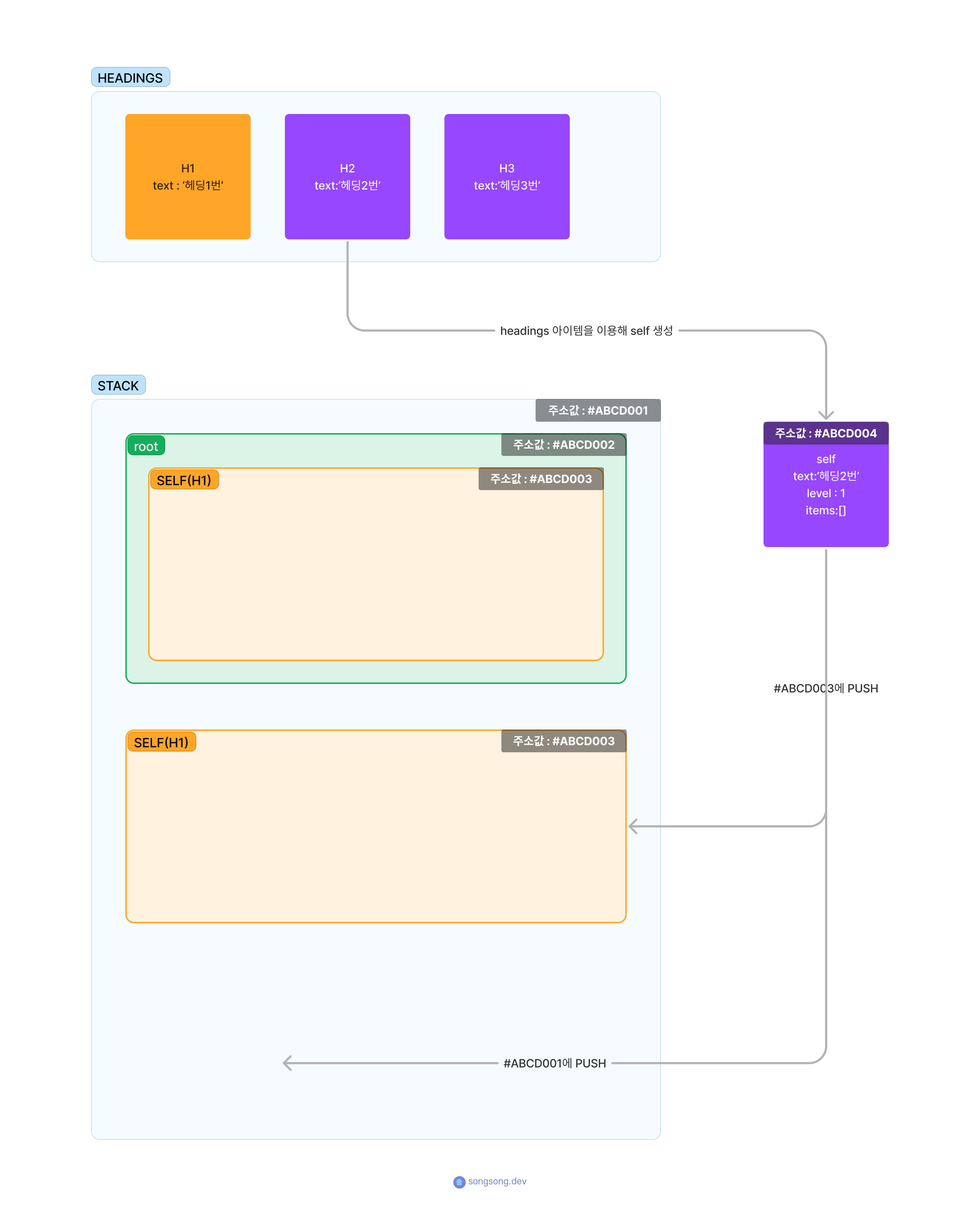 이제 headings[0] 아이템인 text:"헤딩1번" 아이템을 이용해 self오브젝트를 생성한다. 생성한 self를 stack 배열의 가장 마지막 요소(여기서는 root)의 items 배열 안에 push하고 stack배열에도 push 해준다. 이렇게 넣은 요소를 h1이라고 하겠다.