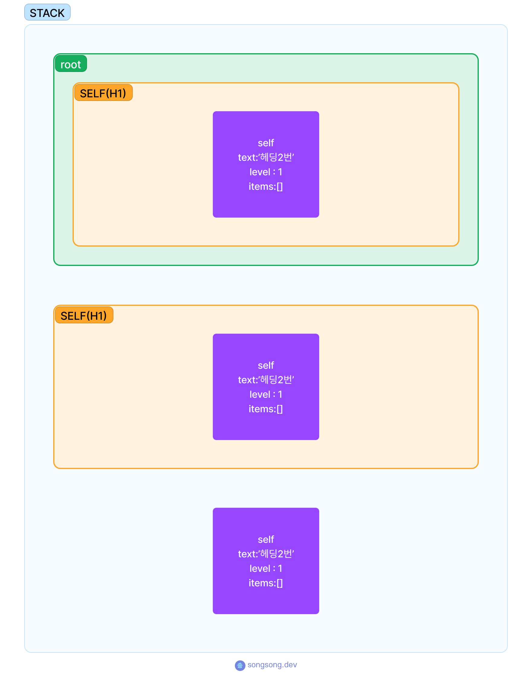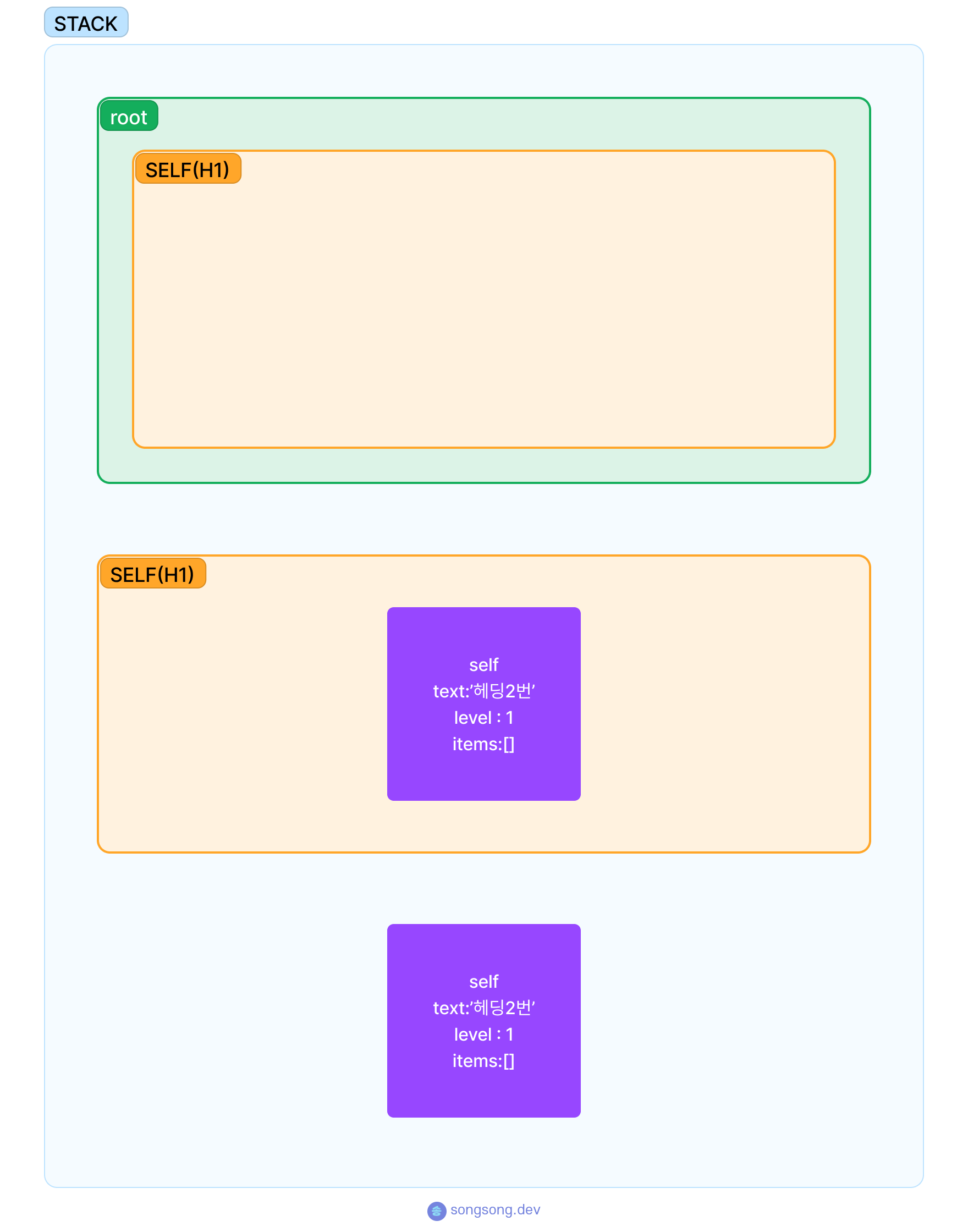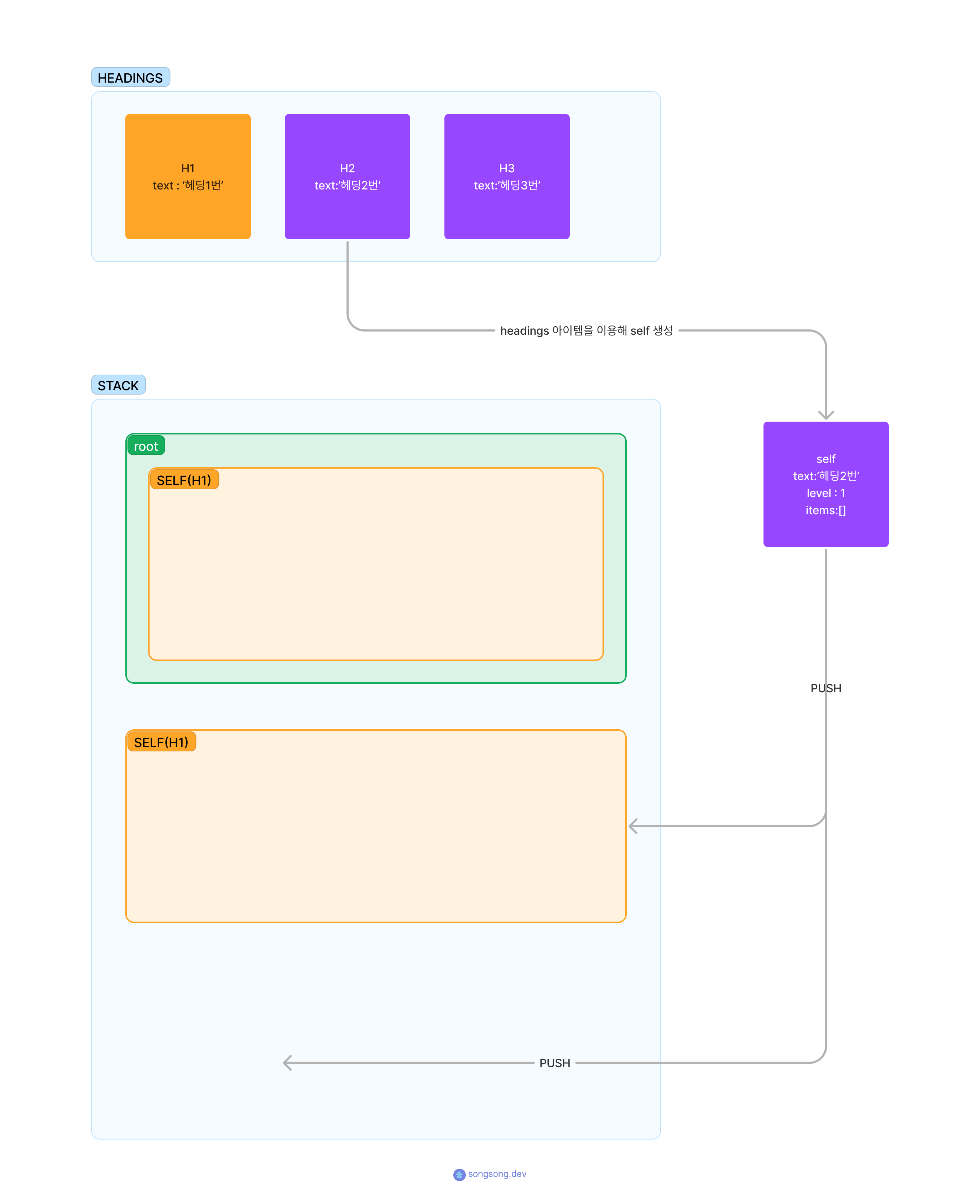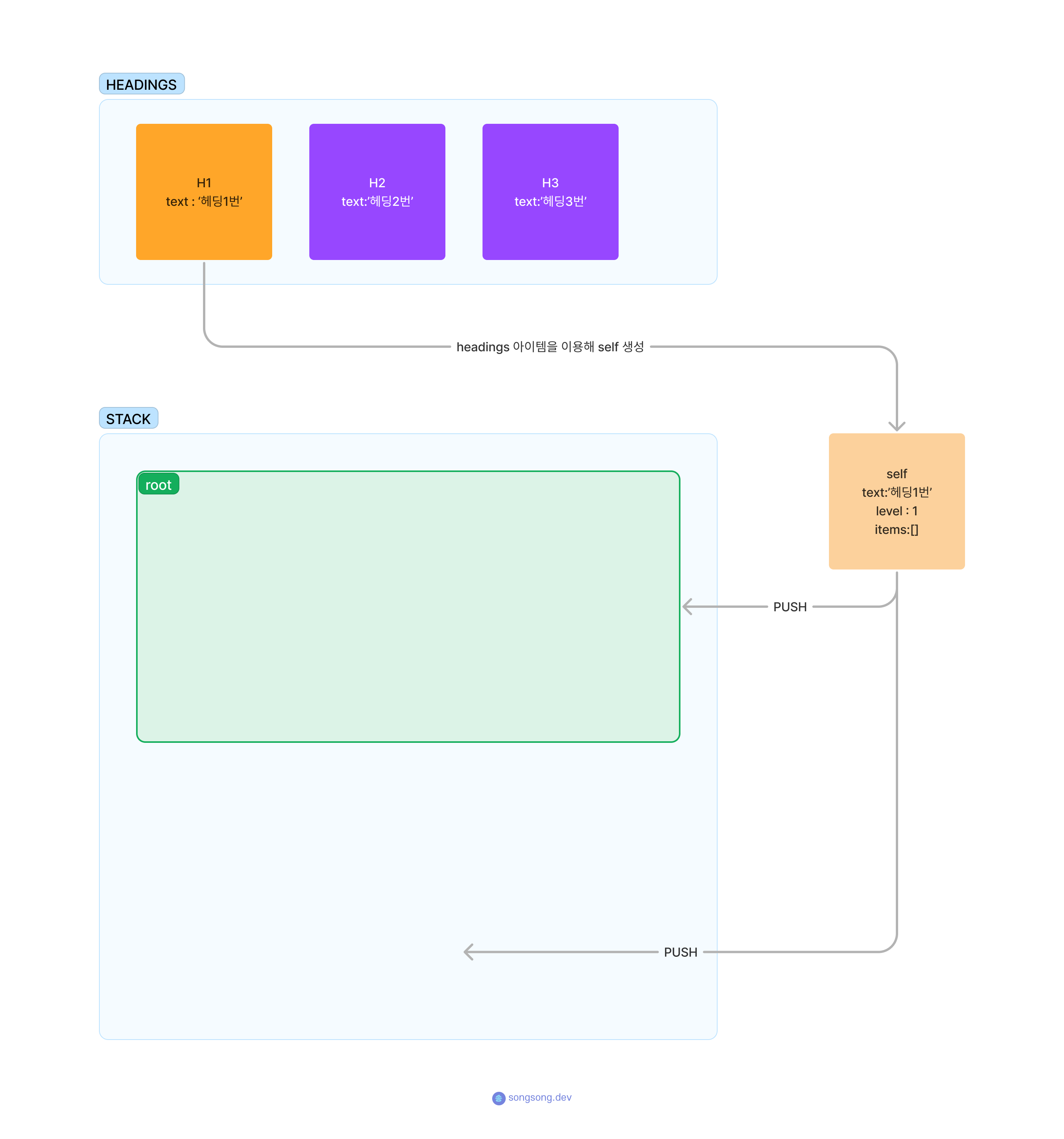 이제 headings[0] 아이템인 text:"헤딩1번" 아이템을 이용해 self오브젝트를 생성한다. 생성한 self를 stack 배열의 가장 마지막 요소(여기서는 root)의 items 배열 안에 push하고 stack배열에도 push 해준다. 이렇게 넣은 요소를 h1이라고 하겠다.