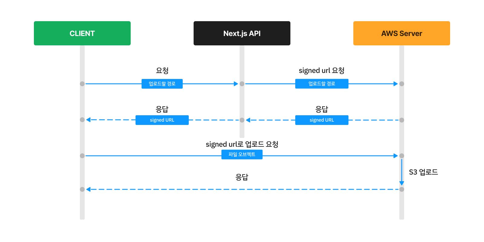// 클라이언트에서 업로드 (aws-sdk getsignedurl 이용)