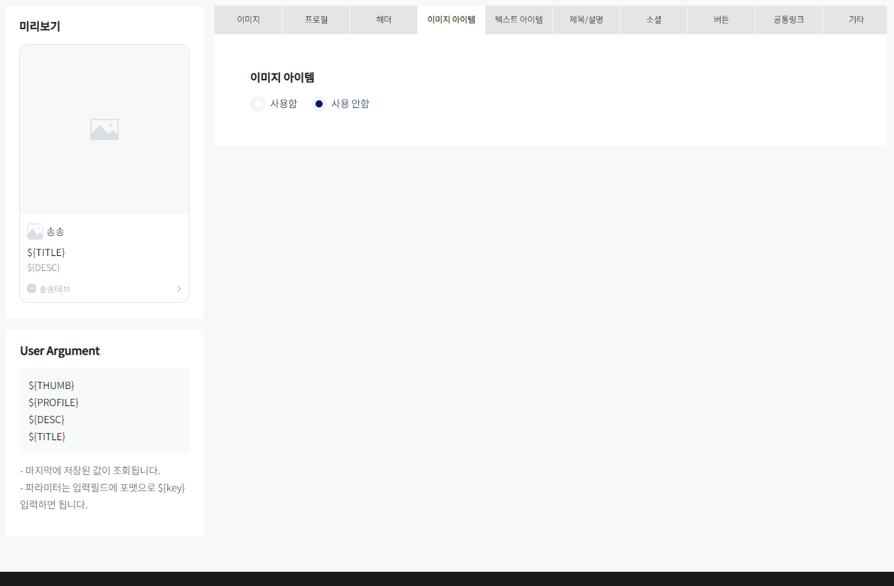 왼쪽 하단의 User Agent 박스가 보이는데, 여기서 지정한 변수로 넘겨주면 원하는 내용이 해당 부분에 들어오게 된다. 만들고 나서 왼쪽 템플릿 목록을 보면 ID 12345가 보인다. 이 번호가 템플릿 ID로, 이 번호를 이용해 템플릿과 소스를 연결한다.