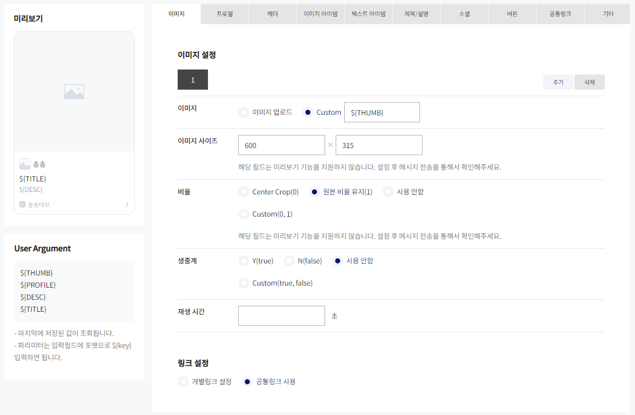 THUMB: '썸네일 주소', // 썸네일 주소 ${THUMB}