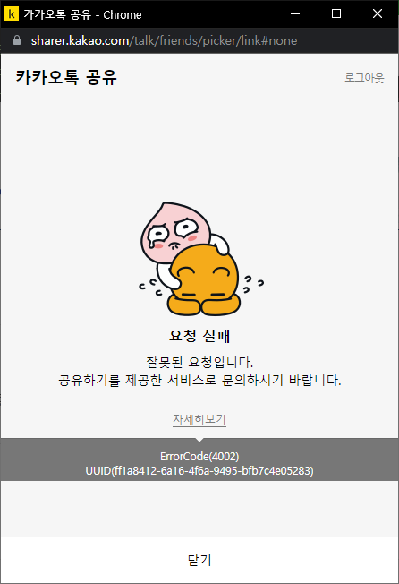 티스토리에는 기본적으로 게시글 하단의 공유 버튼을 눌러 카카오톡으로 공유할 수 있다. 그러나 2차 도메인을 사용하고 있는 티스토리 페이지는 버튼을 누르면 아래와 같은 오류가 발생한다.